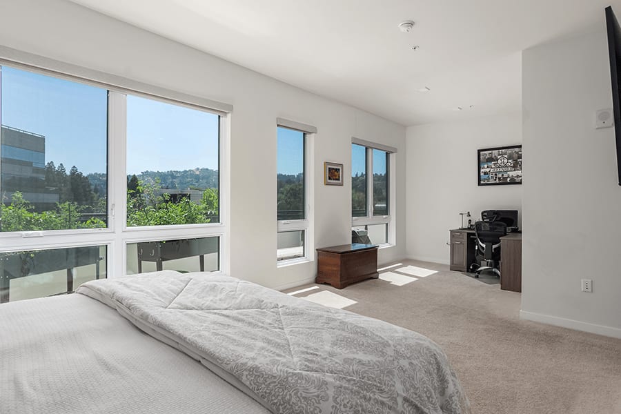 Both bedrooms feature plush carpeting and have view windows with automated blackout shades. The primary suite features a spacious sitting room area or an ideal space for workout equipment or an office nook.