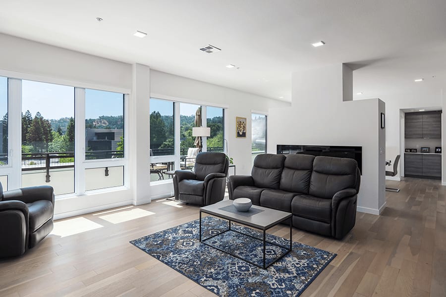 Open the door to the height of sophisticated luxury in this exclusive single-level penthouse condominium in beautiful downtown Walnut Creek. About 1,923 square feet of light-drenched living space is appointed in a chic urban style with white oak hardwood flooring, high ceilings, recessed lighting, and a wall of windows with access to a private balcony. In pristine like-new condition, the condo features a great room with a sleek open kitchen with European-style cabinetry, expansive living and dining areas divided by back-to-back gas linear fireplaces, two bedrooms, two and a half bathrooms, plus an office/library. This unit also has three designated parking spaces in the secured parking garages.
