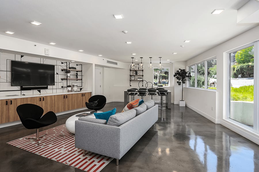 Luxury living at its best showcases a secured six-level building with a welcoming lobby, fireplace, seating areas, and a fabulous rooftop terrace with a built-in barbecue, bocce ball court, and a mounted flatscreen television and lots of room to gather with family and friends.