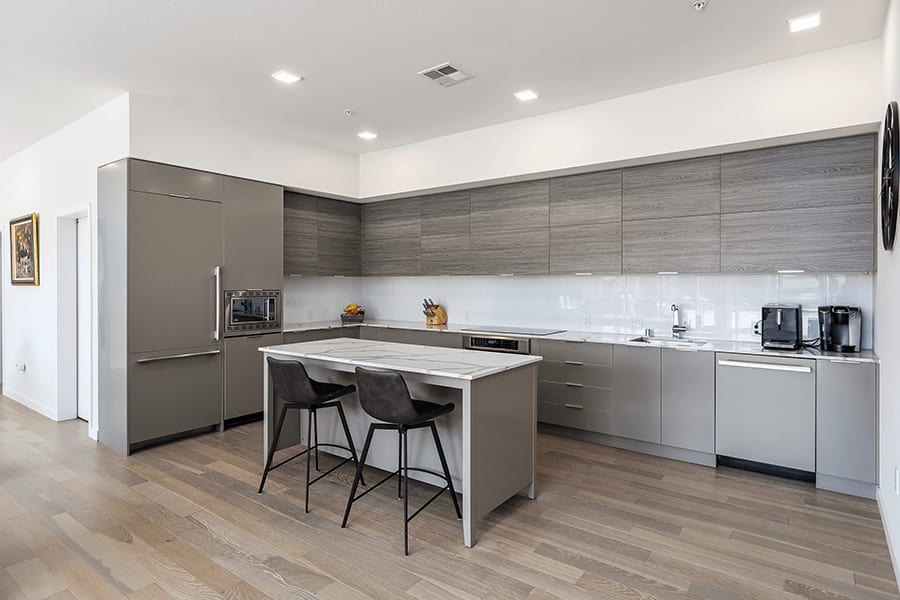 Stylish and functional, the chef's kitchen showcases the sleek design of lacquer-finished cabinetry, quartz counters, and full quartz backsplash, a large island/breakfast bar, stainless sink, and upgraded appliances, including a Thermador™ induction cooktop, oven, microwave, Bosch™ dishwasher and refrigerator, and an under-counter wine refrigerator.