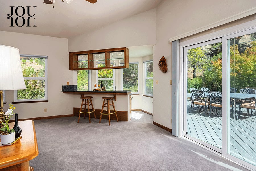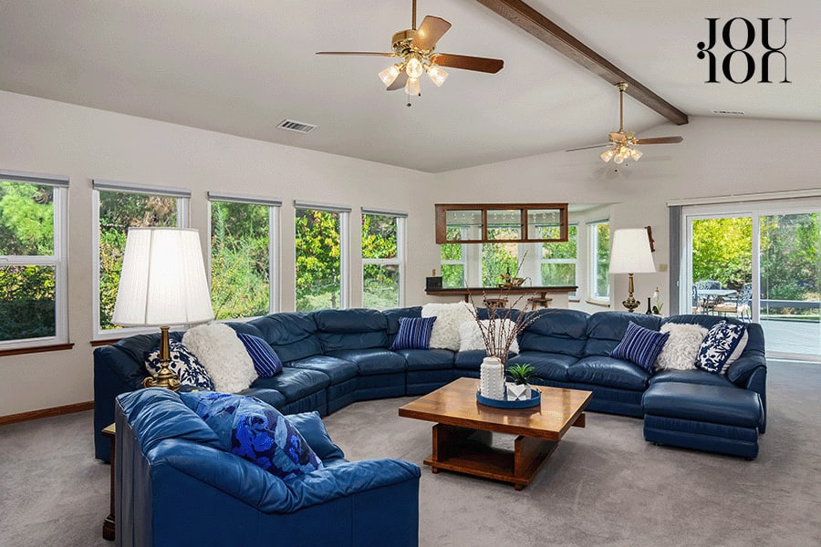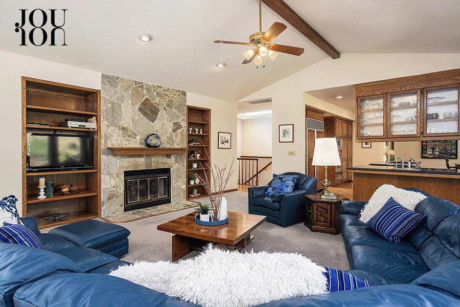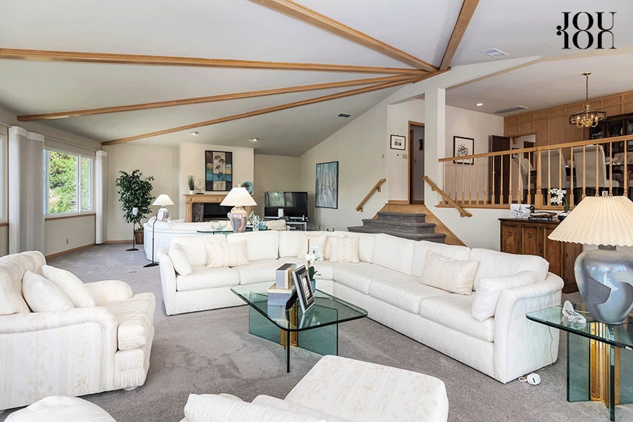The 1,000-square-foot living room is designed for multiple conversation areas with a stunning exposed beam ceiling, a wall of westerly view windows, and a gas fireplace with a tile surround.
