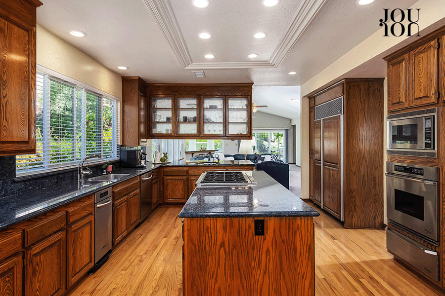 Step into an eat-in chef's kitchen with an adjacent spacious casual dining area, updated finishes and appliances, and a decorative coffered ceiling.