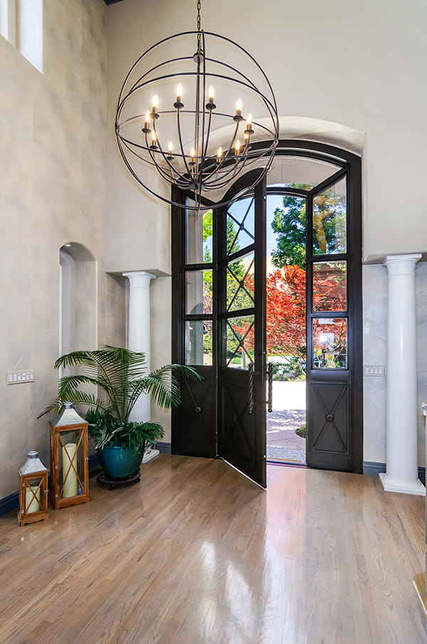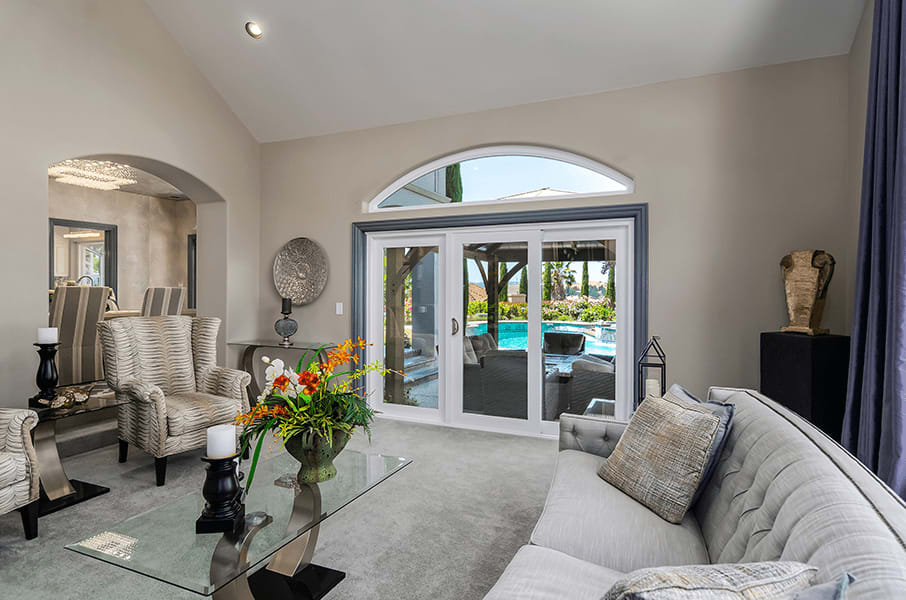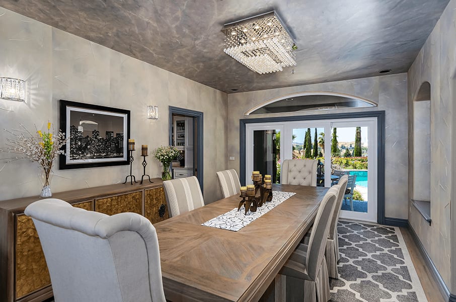 The formal dining room boasts a contemporary crystal chandelier and an arched transom. Slide open the glass doors to extend your dinner party to the backyard patio.