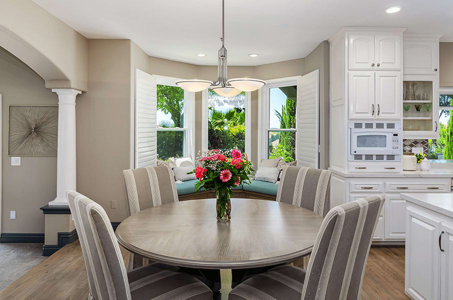 Quartz counters, a large island/breakfast bar with pendant lighting, a stainless sink under a garden window, a walk-in pantry, custom-painted cabinetry, an appliance garage, dual GE Monogram™ ovens, and a Viking™ five-burner cooktop grace the gourmet kitchen, which opens to the spacious casual dining area designed with a built-in window seat under the bay window.