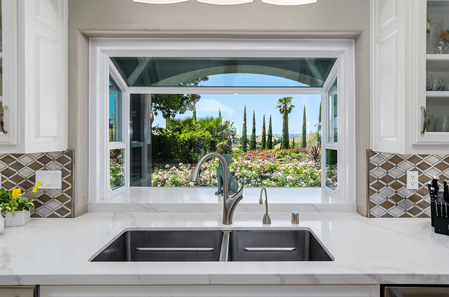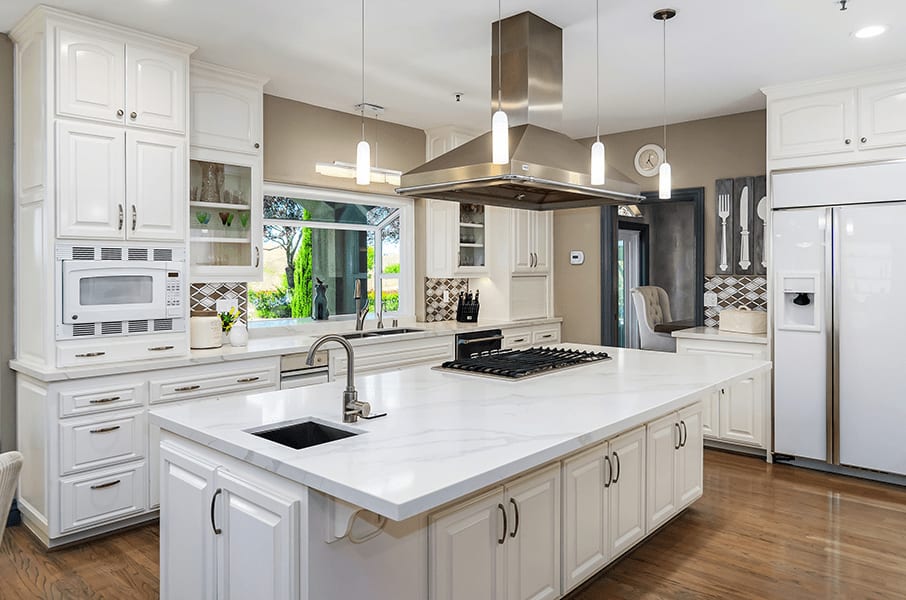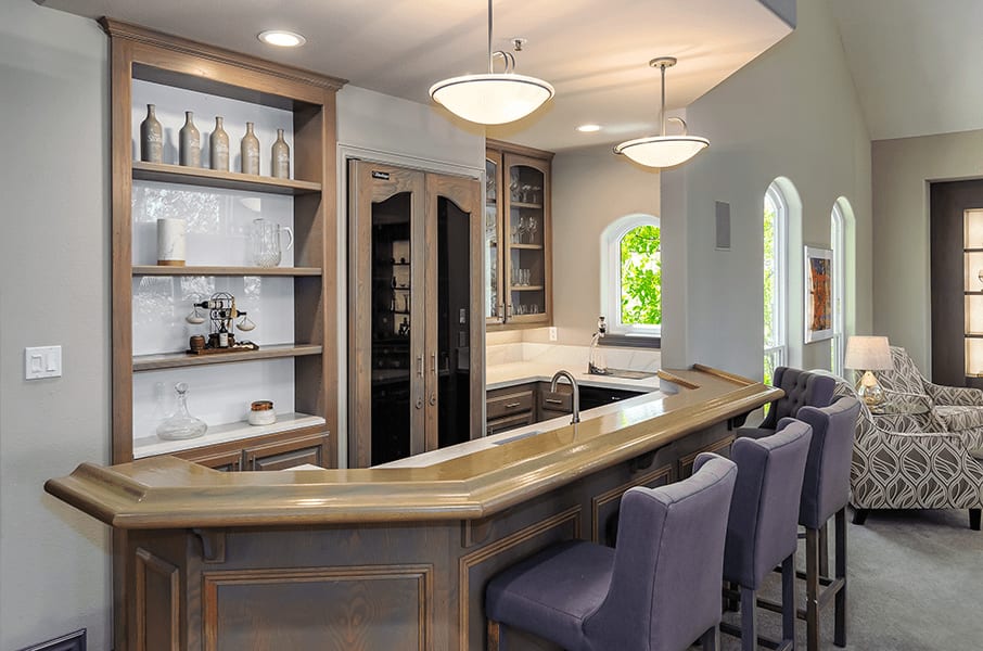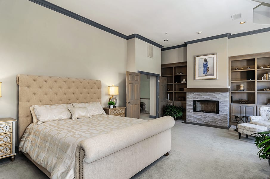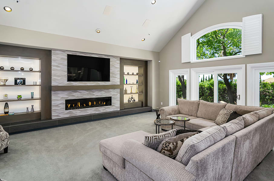 A mounted 75-inch flatscreen television anchors this large family room over a new linear gas fireplace featuring a stunning textured tile surround. Built-in bookshelves on either side feature custom backlighting. Access the backyard easily through the sliding glass door. Don’t overlook the walk-around bar and its 440-bottle full-sized wine refrigerator, prep sink with a new satin nickel finish faucet, and quartz counter.