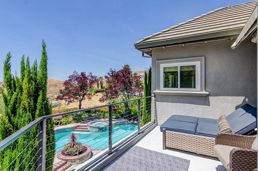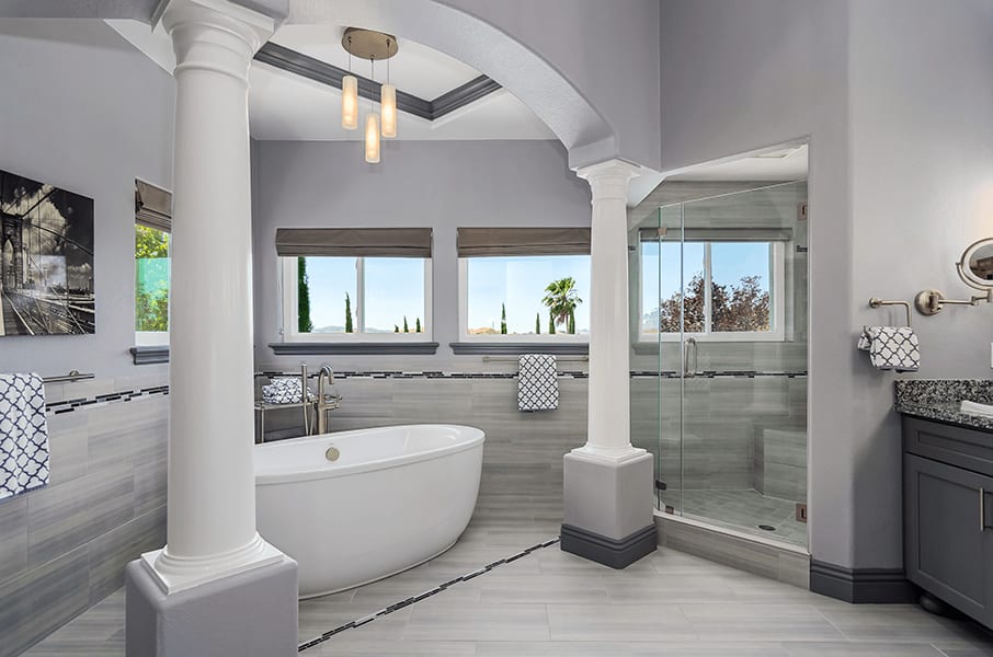 The primary suite behind a double-door entry is at the top of the grand staircase. Sumptuous retreat with vaulted ceiling, spacious sitting room area in front of a new gas fireplace, and access to a private balcony overlooking the pool, gardens, the 14th tee box at the Falls Golf Course, and mountains in the distance. Enjoy the view from the comfort of the retractable awning. Glass French doors open to the en suite updated with a porcelain tile floor, decorative tile wainscot, a dual sink vanity topped with a granite slab, and a walk-in closet. Enjoy breathtaking views from the freestanding bathtub or the oversized shower.