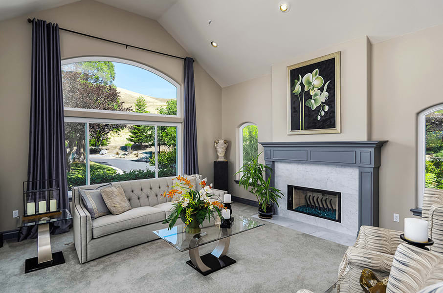 The formal living room features large picture windows and a fireplace with a new marble surround. Sliding glass doors open to the backyard patio.