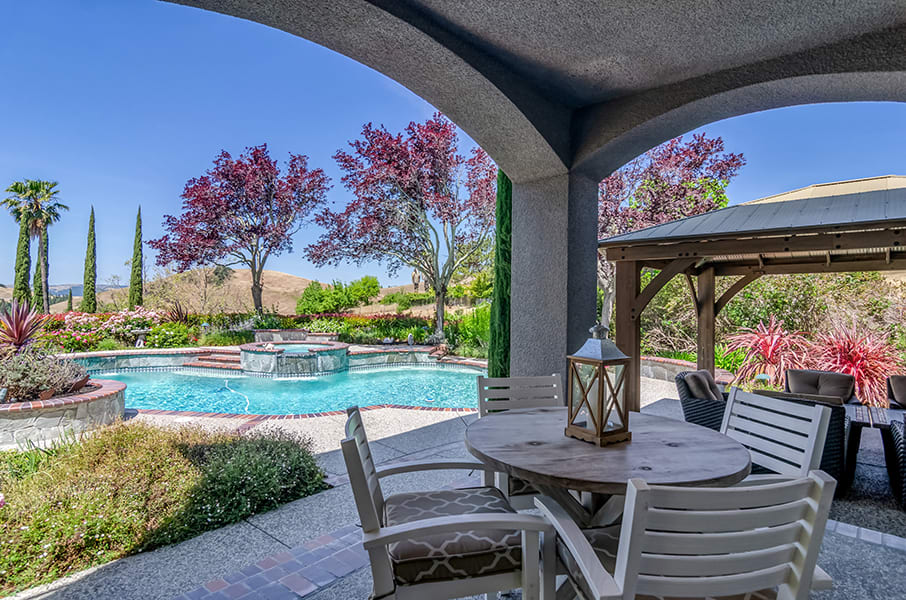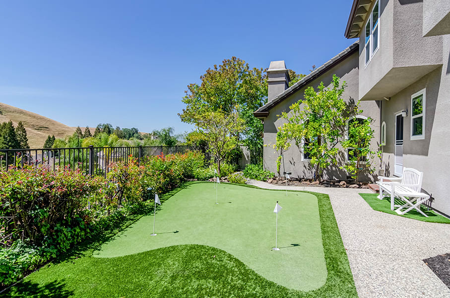 Relish the peacefulness and the amazing sunset views from your private backyard sanctuary with a pool and spa heated by updated solar panels, a refreshed and manicured landscape, a new fountain, exterior light fixtures, a pergola, and patios. Mature trees illuminated with up lighting and lush foliage, including roses, climbing over arbors bursting with seasonal color, wrap around the yard, including a side yard putting green, a hot tub, and a garden shed.