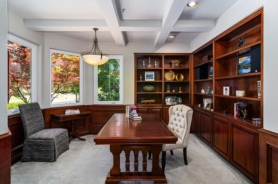 Main-Level Executive Office/Guest Bedroom with cherry wood wainscoting and a box beam ceiling.