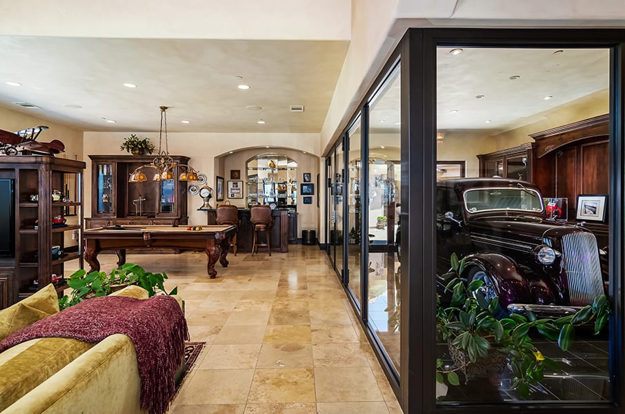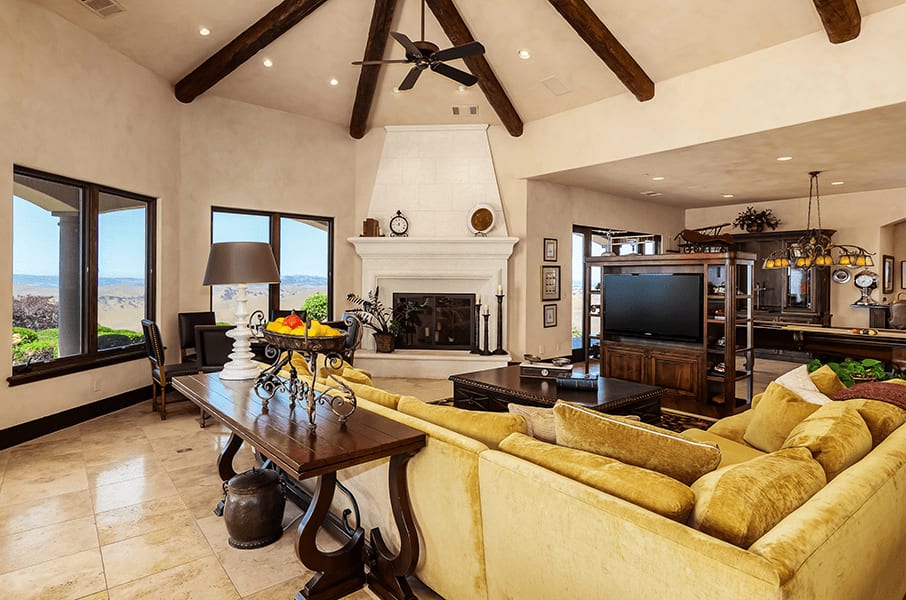 An exposed beam ceiling soars to great heights in the expansive family room featuring a grand gas fireplace and a dual-sided, walk-around media cabinet that it shares with a billiards/game room.