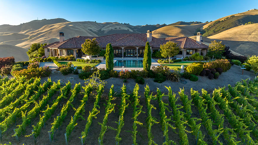 The Mediterranean landscape inspired this Italian villa, complete with rows of 1,600 Zinfandel, Petit Syrah, and Sangiovese grapevines ripening in the sun and a seasonal stream. Plans sketched on a napkin by the owner were brought to fruition by renowned local architect William Wood who noted that careful consideration was given to this site's unique location and wind direction in the planning stages to maximize the impressive 100-mile views of the surrounding hills. This work of art was completed in 2008.