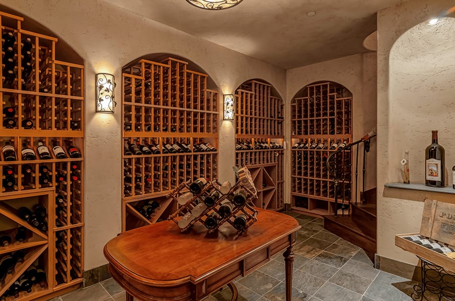 A temperature-controlled wine cellar at the bottom of a circular staircase with custom-forged iron railings features double-deep racks and storage for about 4,000 bottles.