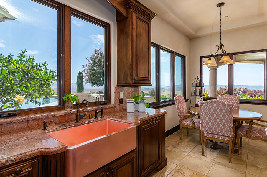 The adjacent gourmet kitchen is beautifully appointed with a stunning copper apron and prep sinks, granite slab counters, custom walnut-stained cabinetry, a walk-in pantry, and a sizeable island.