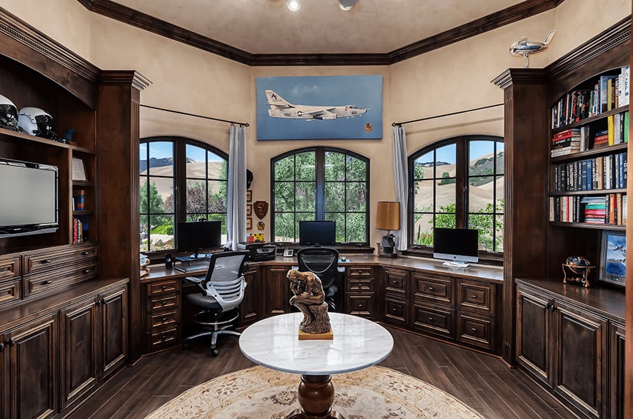An executive office features a panoramic front-facing view, custom-crafted paneling, two built-in workstations, to-ceiling built-ins, and a storage room.