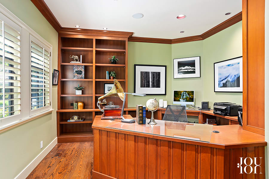 An executive office behind double glass-paneled pocket doors features extensive built-in cabinetry, a built-in desk, a walk-in closet, and views of the front courtyard.