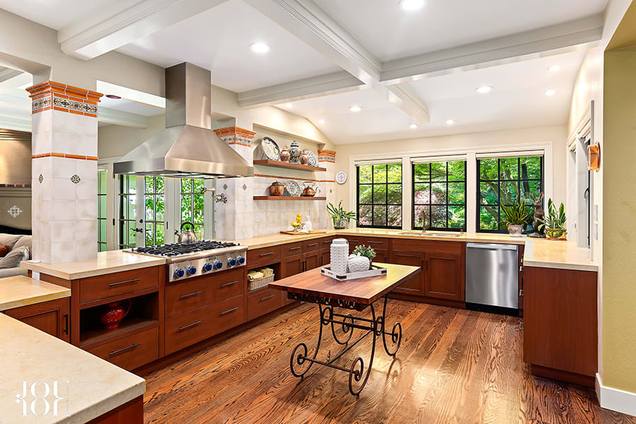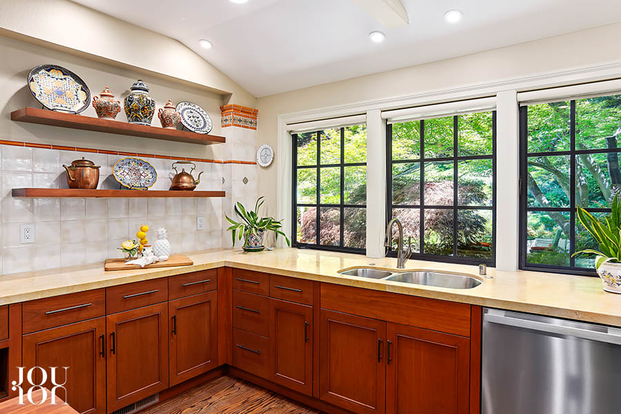 Destined to delight cooks of all levels, the expanded chef’s kitchen showcases stunning limestone counters and a large breakfast bar that meld with the rich, warm tones of custom soft-close cherry cabinetry with pull-out shelves, open shelving, and a decorative tile backsplash.