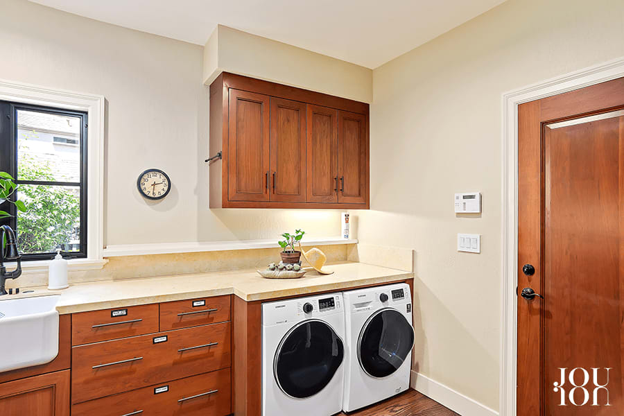 An expanded mudroom/laundry room would also make an ideal hobby room with its Rohl® farmhouse sink, storage cabinets, Corian® counters, and a one-year-young Samsung® front-loading washer and dryer.