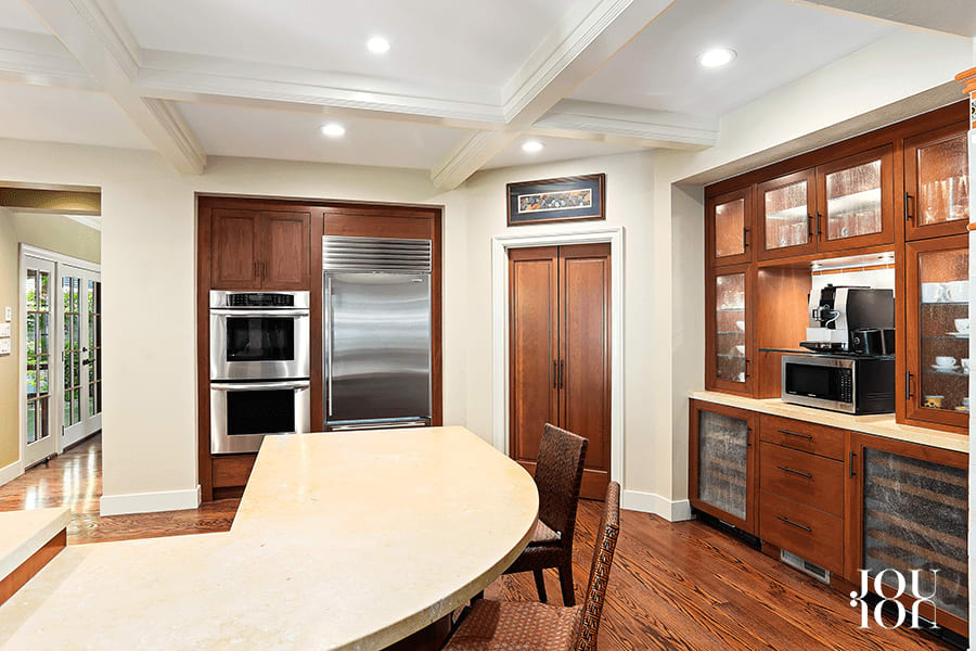 A nearby wine/coffee limestone bar has seeded glass-paneled upper cabinets and a pair of SubZero® wine refrigerators. A walk-in pantry offers additional wine storage racks.