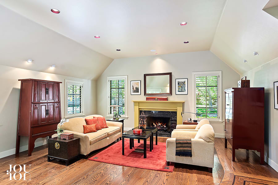 The formal living room is anchored by a gas fireplace and features French doors that open to an outdoor dining venue.
