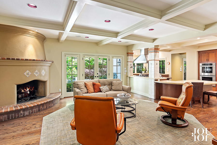 A corner gas fireplace and an exposed box beam ceiling create a warm and inviting ambiance in the adjacent family room. This spacious room also has French door access to the patio with a retractable awning.