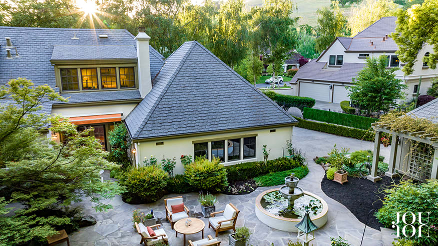 Enjoy the spaciousness of covered and open IPE decks and sprawling patios surrounding a tiered fountain and pond.