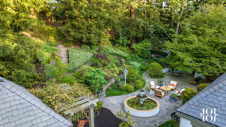 Towering redwoods border the backyard, and pathways traverse the gentle slope among the terraced gardens.