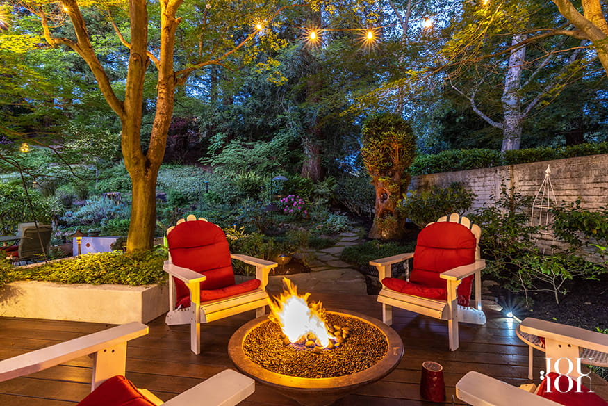 Gather around the gas firepit and barbecue amongst the garden beds poised to burst with seasonal color from mature Japanese Maples and camellias.