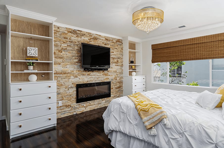 The primary suite is a luxurious retreat with decorative crown molding, a gas fireplace, a ledger stone surround, and a pair of built-in cabinets with dresser drawers.
