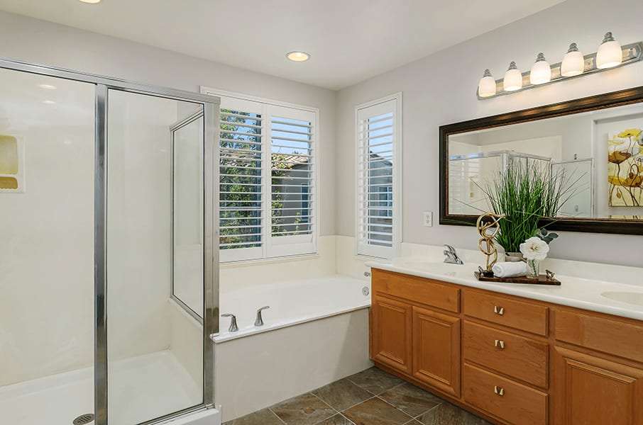 The en suite features a slate-tile floor, a dual-sink vanity, a soaking tub, and a shower.