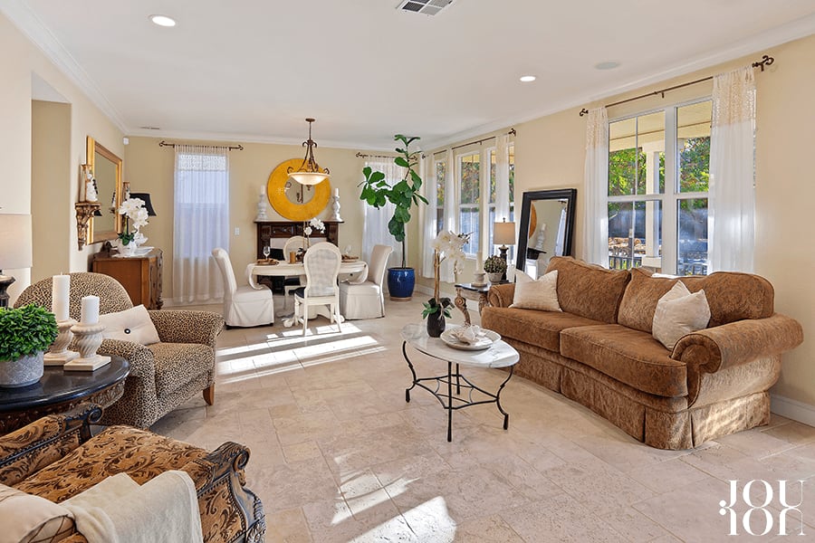 Almost 2,400 square feet of living space behind an inviting front porch showcases travertine and new carpet flooring, decorative crown molding, and baseboards, LED lighting, custom wall paint, multiple build-ins, fresh exterior paint, new window screens on dual-pane windows, plantation shutters, and ceiling fans.