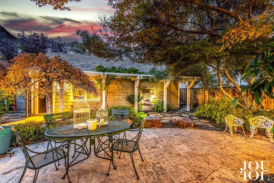 Formal living and dining areas, an updated chef's kitchen open to a casual dining nook and spacious family room, a loft, and three bedrooms and two and a half bathrooms are filled with natural light and views of the surrounding hills and backyard gardens.