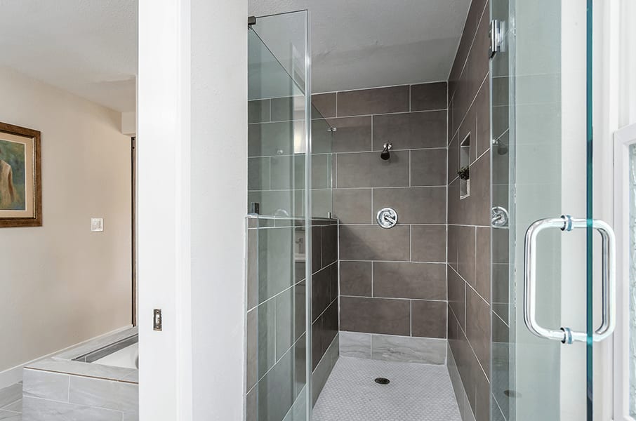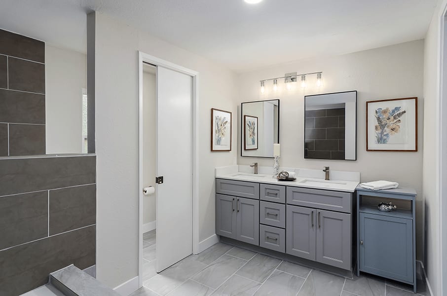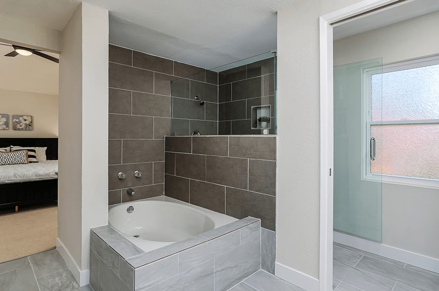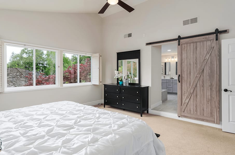 A barn door slides open to reveal the newly redesigned en suite bathroom with a large walk-in closet. Porcelain tile floors, a new soaking tub, a walk-in shower, a marble-topped, dual-sink vanity, and new fixtures update this spa-inspired space.
