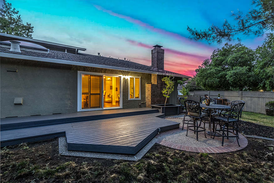 The backyard’s newly painted deck and garden, where there is lots of room to spread out and entertain, play, or relax in the peaceful surroundings.