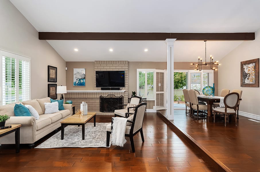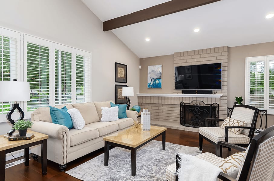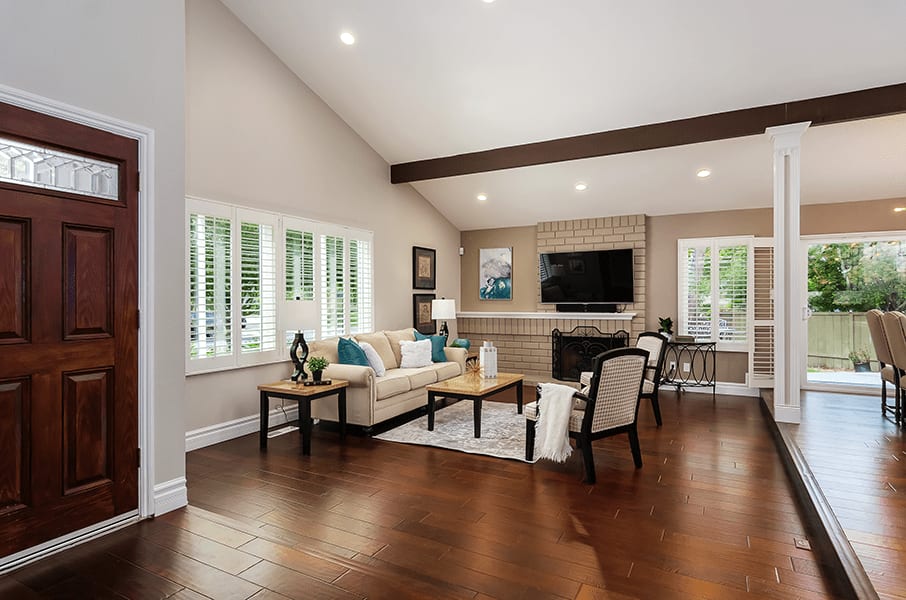 Step down into the formal living room that features a vaulted, exposed beam ceiling, a gas fireplace, and a front-facing picture window with plantation shutters.