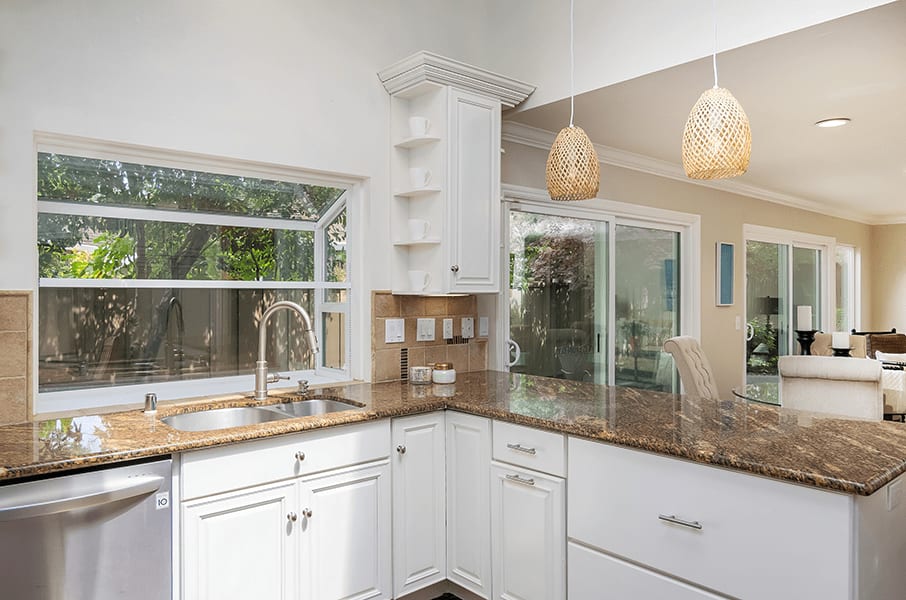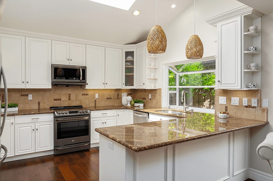 New appliances, including an LG range and microwave (still under warranty), painted cabinetry, and bright, natural light enhance the chef’s kitchen, featuring granite counters and a peninsula island/breakfast bar illuminated by a pair of pendants. The kitchen also features an LG dishwasher and refrigerator, and a stone-tile backsplash with decorative glass tile inlays. The kitchen is open to the casual dining area and the family room, which includes a new bar with a marble counter and painted cabinetry. Two sets of sliding glass doors open to the backyard gardens.