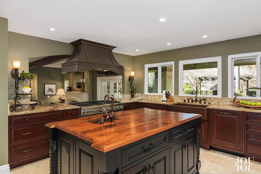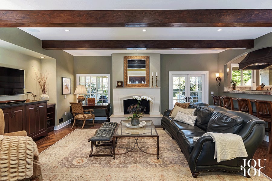 A gas fireplace with a custom French limestone mantle anchors the spacious family room with an exposed beam ceiling, a niche for the media center, and glass paneled pocket doors for privacy. Sit at the raised black walnut cocktail/breakfast bar and don’t miss the action in the adjacent kitchen.