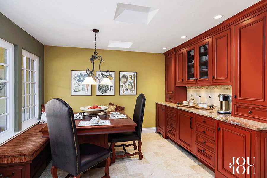 Built-in custom cabinetry, a quartzite counter, and a SubZero™ wine refrigerator line one side of the casual dining nook that also features dual skylights and built-in bench seating.