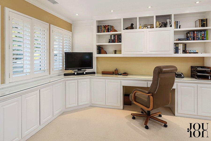 Glass pocket doors separate the bedroom from a sizeable flexible-use space. The built-in cabinets make it an ideal work-front-home venue or consider creating the ultimate reading retreat, a home gym, or a nursery.