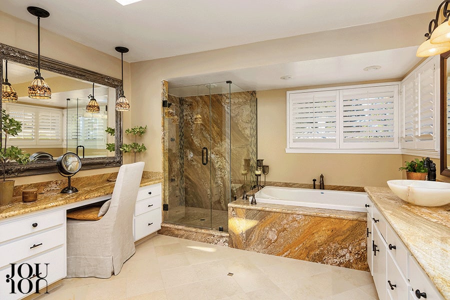 Limestone covers the floor in the primary en suite bathroom that also features a new Jetta™ spa tub, granite-topped vanity, dual white onyx vessel sinks, and an oversized shower with a granite surround, rain shower head, and body jets.