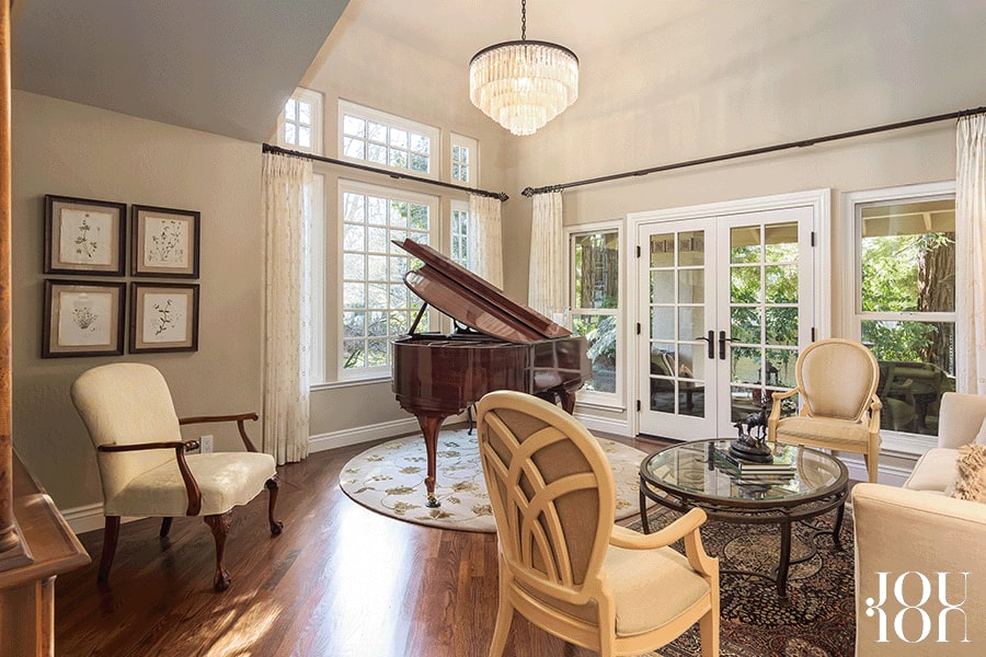 The front-facing formal living room features a vaulted ceiling illuminated by a crystal chandelier.