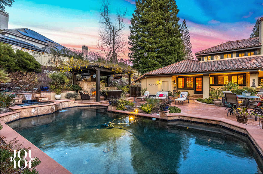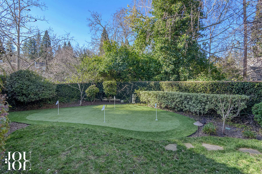Towering redwoods, meandering flagstone walkways, expansive Saltillo™ tile patios, loggias, a wall fountain, a four-hole putting green, and gardens wrap around the pebble tec pool and spa.
