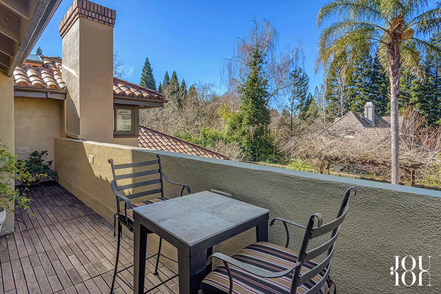 Enjoy access to a private balcony overlooking the backyard gardens and pool.