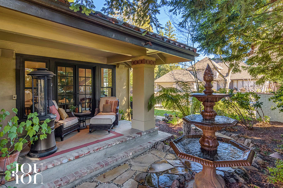 Open the French door to access a private loggia and enjoy the serenity of this setting near a tiered fountain, garden beds, and towering trees.