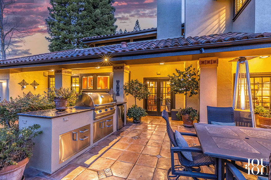 Enjoy the outdoor pavilion with a wood-burning fireplace and heaters, or gather around the built-in FireMagic grill with counter space with an outdoor under-counter refrigerator.