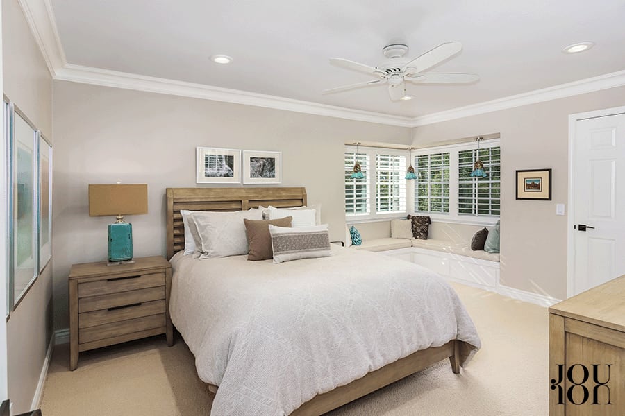 The main-level bedrooms feature generously sized walk-in closets, plantation shutters, and ceiling fans. One room has built-in window seats with additional storage.