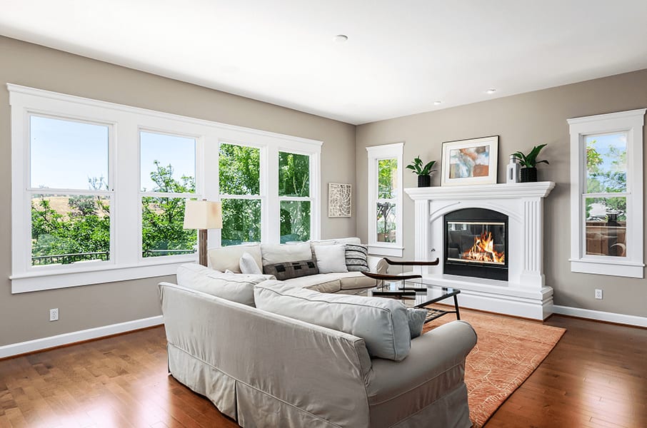 A gas fireplace with a carved mantel anchors the formal living room with a front-facing window and a view of the centralized courtyard.