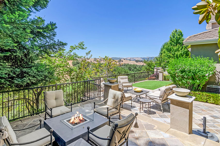 Retreat to the slate tile patios overlooking the incredible vistas of rolling hills and gather around the gas fire pit.