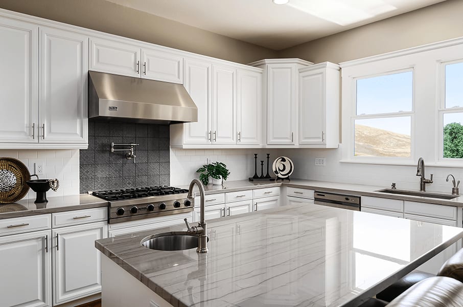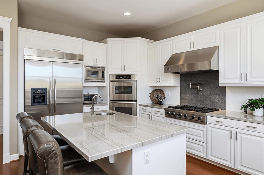 The spacious chef’s kitchen is well appointed with polished quartzite counters, a subway tile backsplash, an island/breakfast bar and seating for two, a Rohl™ stainless farmhouse sink, and white cabinetry with stylish brushed nickel pulls. Appliances include a Viking™ six-burner cooktop with a decorative tile backsplash, dual KitchenAid™ ovens, dual dishwashers, a microwave, and a French door refrigerator.