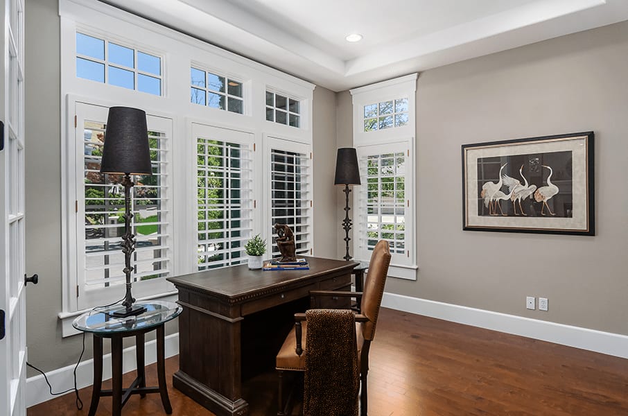 Behind glass French doors is a flexible-use space with an en suite ideal for an executive office. The built-in Murphy bed makes it convenient to convert into a fifth bedroom.