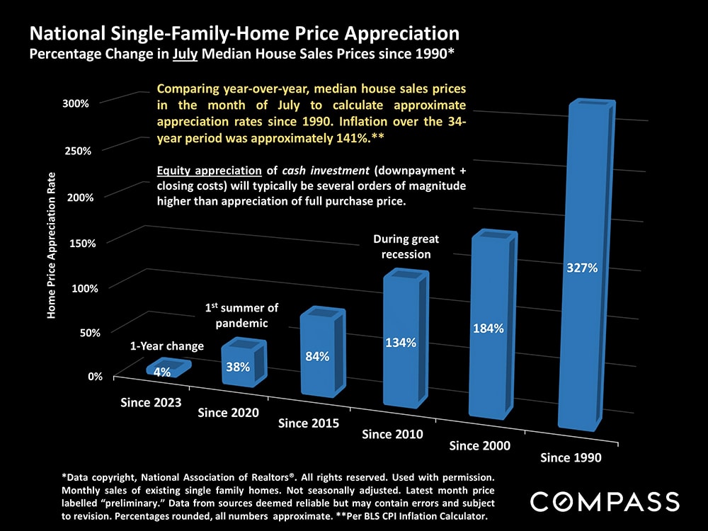 Median house sales price appreciation since 1990: An illustration of how home ownership so often builds household wealth over time.